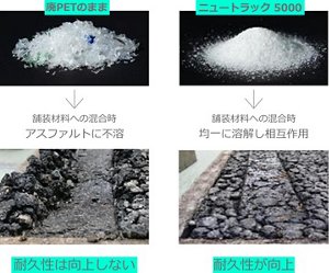 以前にも、使われなくなった廃棄PETの処理を目的として、アスファルト舗装内にそのまま砕いて混ぜ込む例はあったのですが、それでは廃棄PETの利用にはなるものの、舗装の耐久性向上にはつながらなかったんです。