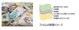 立浪:つめかえパックのフィルムは、薄さ100~150マイクロメートルの中に、5~9つの複合素材が使用されていたり、それが何層にも重なっていたりします。中身の剤を長期間変質させないように守る必要があるので、つめかえパックはこのようにとても複雑な構造になっているのですが、これこそがつめかえパックのリサイクルが困難を極める最大の理由です。