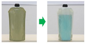 これは、元のつめかえパックの印刷部分の影響によるものでした。再つめかえパックの色がすべてこの色になってしまうと、商品デザインの幅を狭めてしまうので、なんとかして色を薄く・透明に近づけるように試行錯誤を重ね、現在、色を薄くした試作品までたどり着きました。