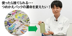 つめかえパックは本体容器に比べてプラスチックの使用量が少なく、地球にやさしいということは皆さん想像できると思います。しかし、技術的にリサイクルが難しく“つめかえ終わったら捨てられてごみになってしまう”のが現状です。