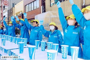花王本社前の沿道でランナーに声援を送る花王社員